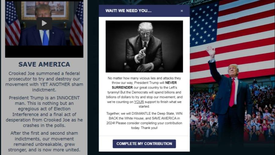 On Tuesday evening, Trump’s website was quickly updated with a new request for more money to keep fighting against attempts to “destroy our movement with YET ANOTHER sham indictment”.