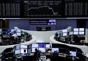 © Reuters. FILE PHOTO: The German share price index DAX graph is pictured as the German index celebrates its 35th…