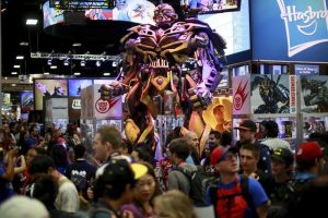 © Reuters. FILE PHOTO: People walk past the Beyblade Burst Speedstorm, by Hasbro, Inc., on display in the FAO Schwarz…