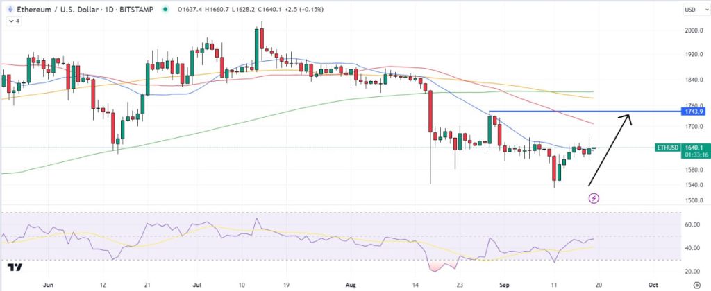 Ether was last changing hands around $1,640, just to the north of its 21DMA.