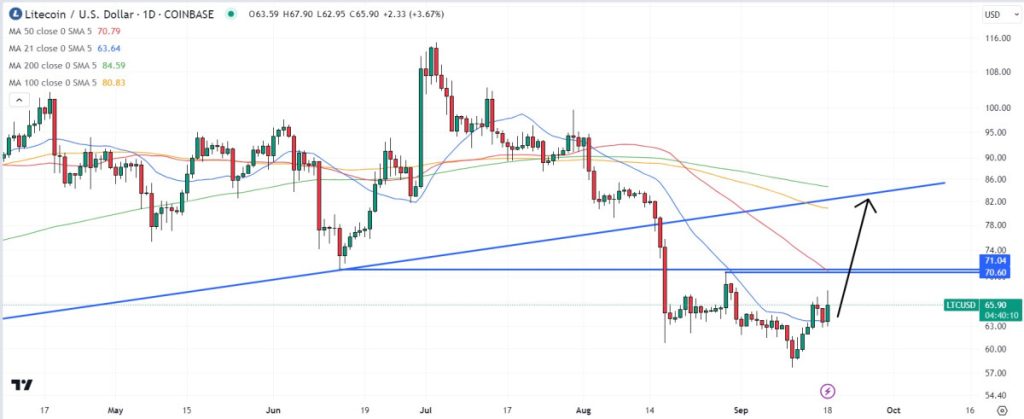 LTC was last trading near $66 per token, having briefly fallen under $58 at the start of last week.