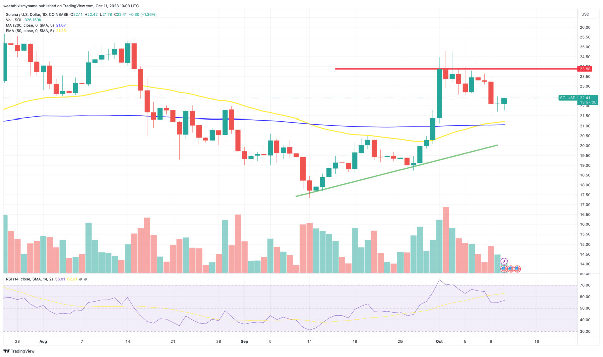 The Solana price has jumped by nearly 1% in the past hour, with its move to $22.37 also representing a 0.3% gain in the past 24 hours.