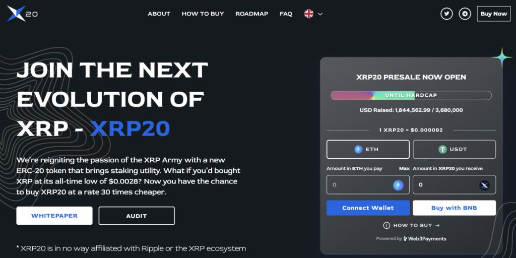 To buy XRP20, head over to the website, connect your crypto wallet, and pay with Ethereum or USDT.