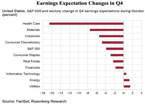 The economy can’t be very good when earnings expectations in seven out of 10 sectors are falling. The chart shows that health care costs lead the way with a -16%+ reduction in Q4 earnings. For the S&P 500 as a whole, expectations are for a -4% in earnings growth. The equity market is quite sensitive to these earnings’ expectation changes.