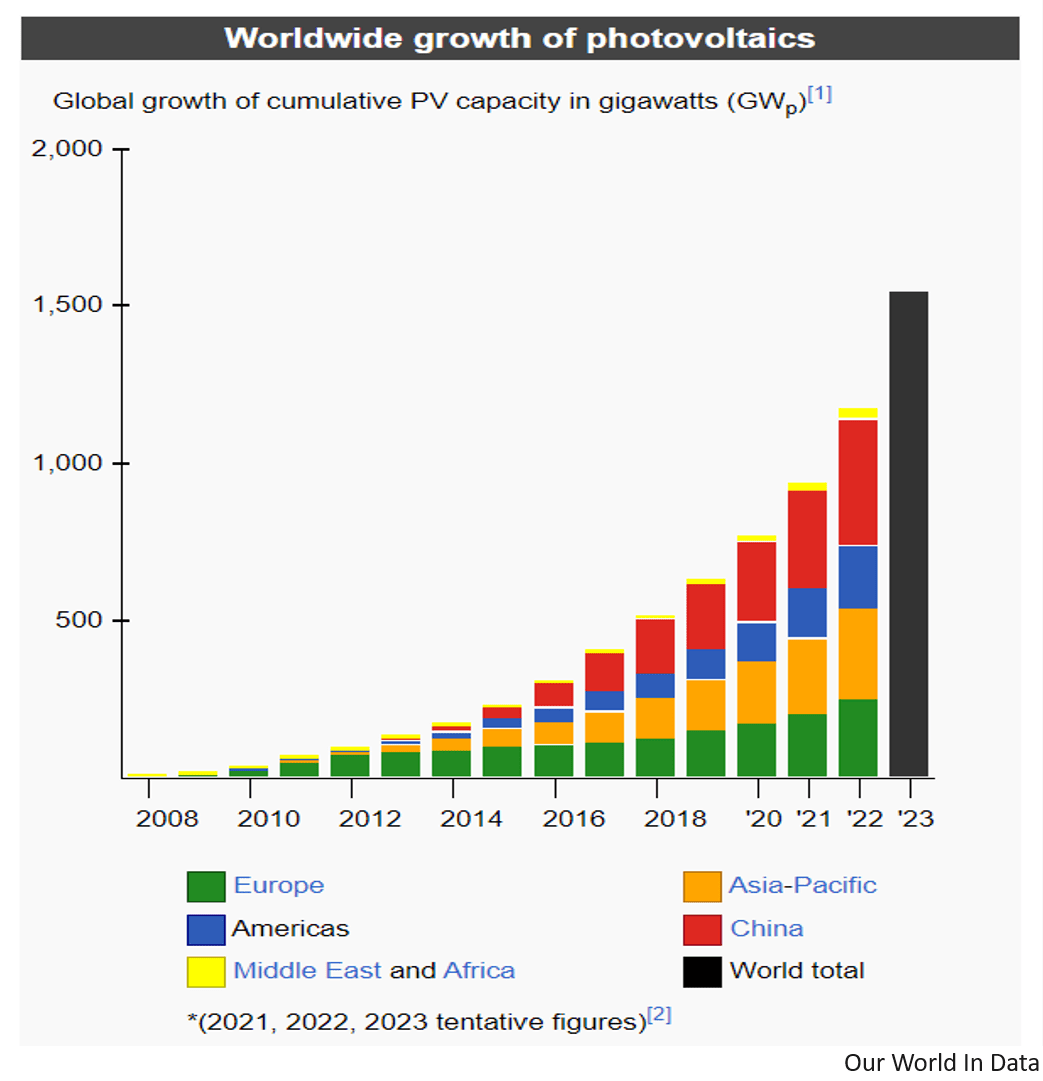 - The installation and utilization of solar power has accelerated world-wide, and solar is now the fastest-growing source of electricity. World solar capacity will exceed 1,500 gigawatts by the end of this year. Canadian electrical generation from all sources is only about 155 gigawatts. While solar is not a “one stop” solution to the world’s energy problems, there is no other source of energy that has experienced this rapid growth. Solar is replacing coal at a breakneck pace. The UK is now using less coal than at any time since 1750.